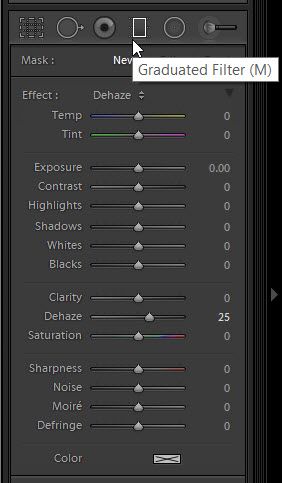 Select the Graduated Filter by pressing keyboard shortcut M or by selecting the Graduated Filter icon. From the Effects dropdown menu select Dehaze. This tool will gradually apply the effect on the image when you click and dragging it over an area of the image. You can increase or decrease the effect by adjusting the Dehaze slider.